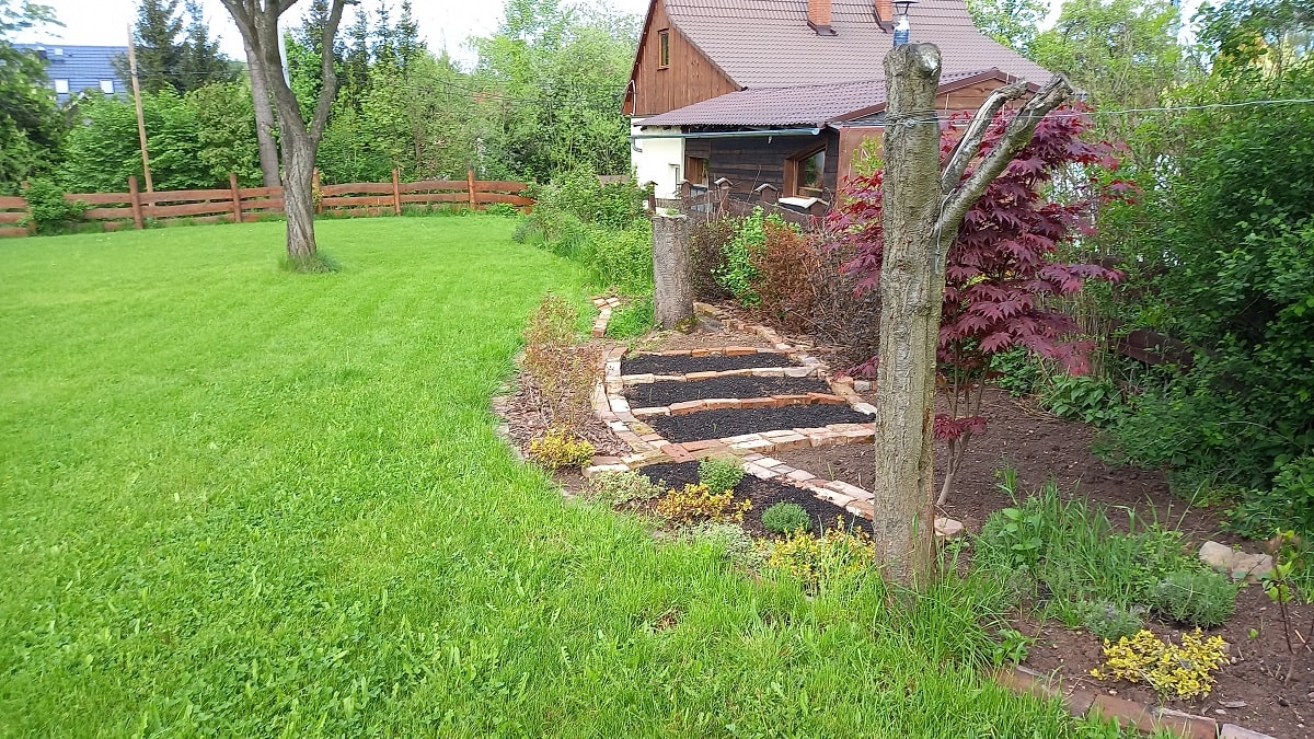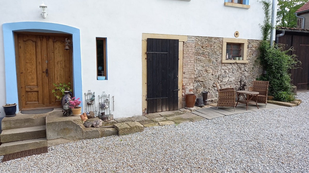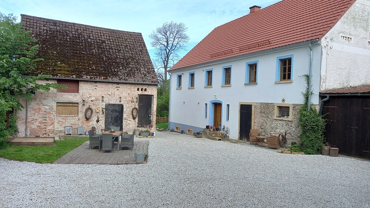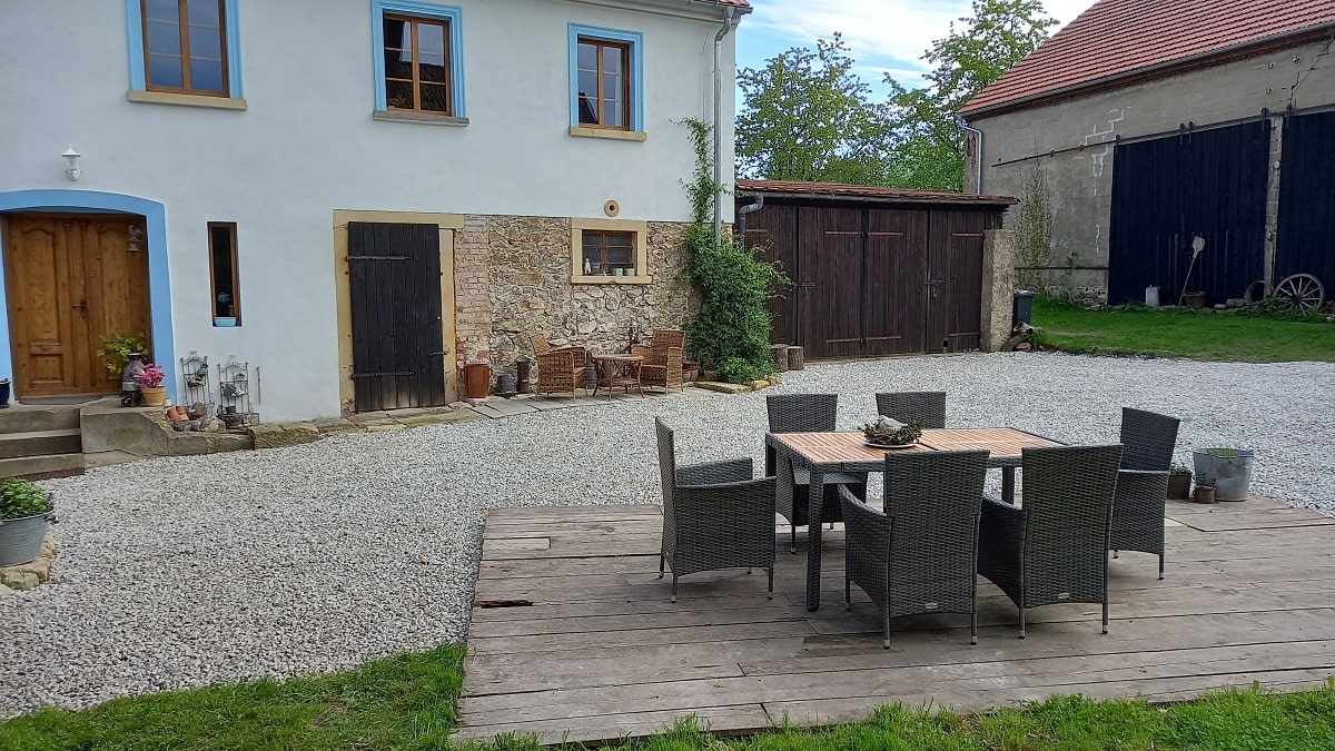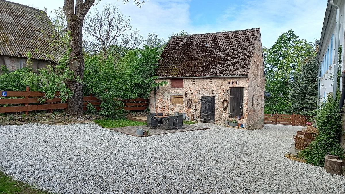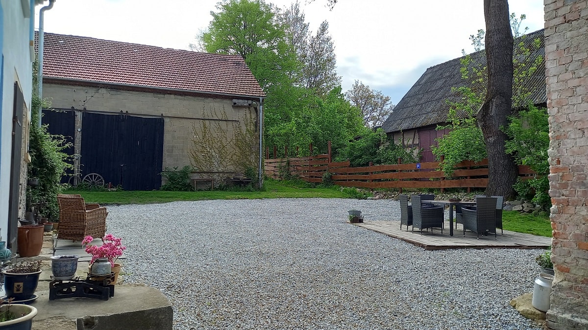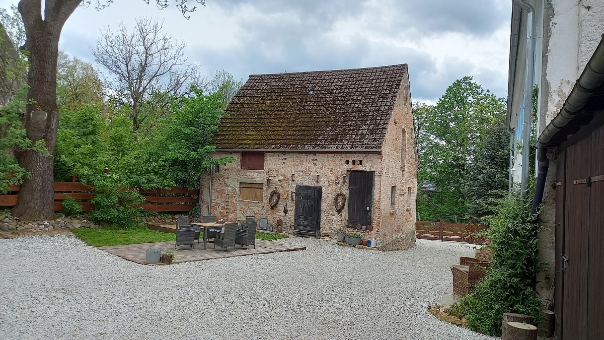 Dziedziniec – to przestrzeń pomiędzy wszystkimi budynkami naszego siedliska, ale można tutaj znaleźć miejsce zarówno na biesiadowanie na tarasie, wygrzewanie się na słońcu w zależności od pory dnia czy też zabawę dzieci w piaskownicy pod zdalnym nadzorem dorosłych będących w tym czasie w kuchni na piętrze.