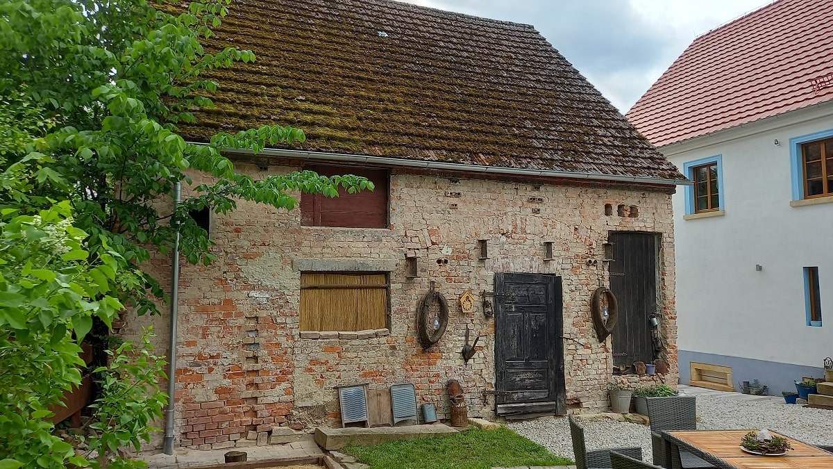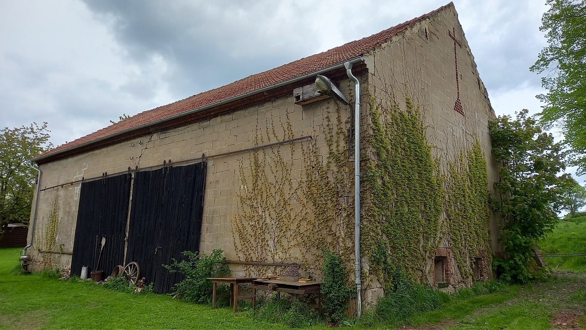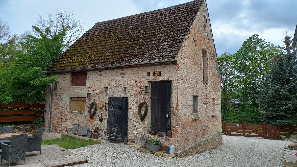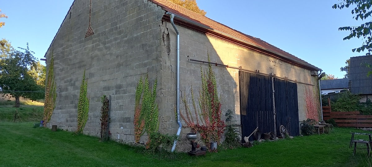 Stodoła – jak to stodoła, służyła kiedyś rolnikom do magazynowania owoców ich ciężkiej pracy, dlatego gabarytowo jest większa niż Biała Kalina. Z ciekawostek znajdują się w niej jeszcze nadal stare maszyny rolnicze, ale to naprawdę stare – nawet z oryginalnymi niemieckimi napisami. I chyba mamy już pomysł na to jak je wyeksponować…..