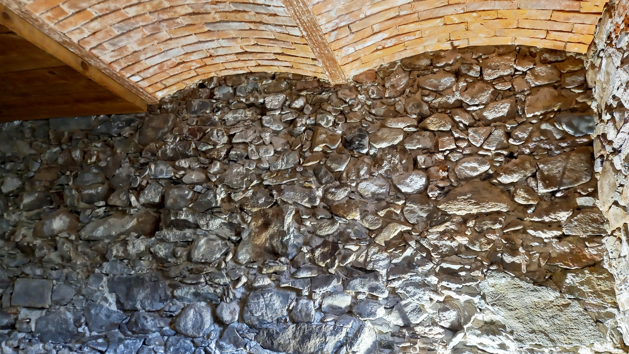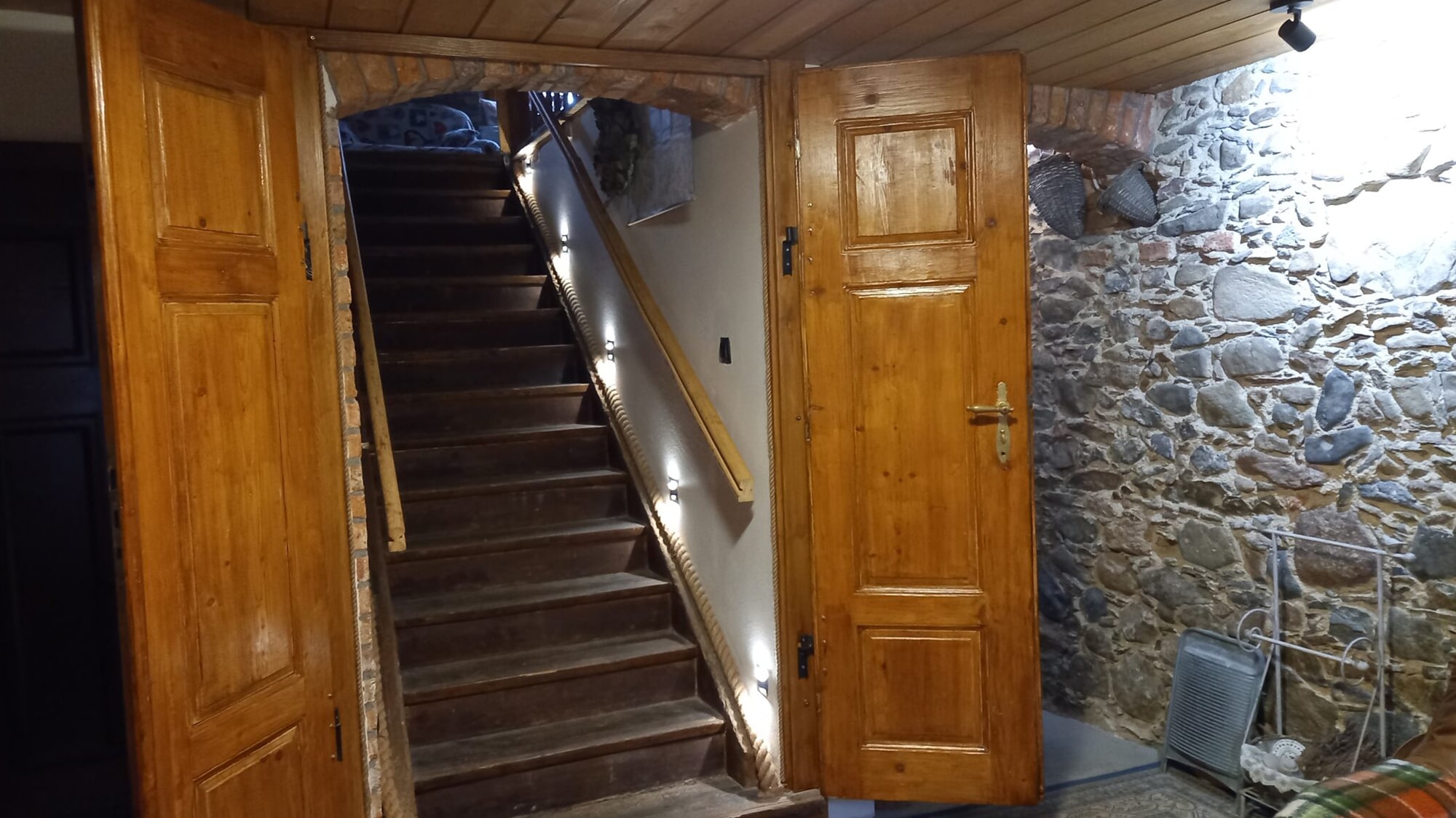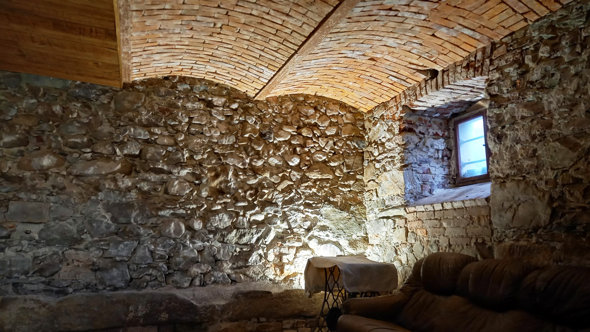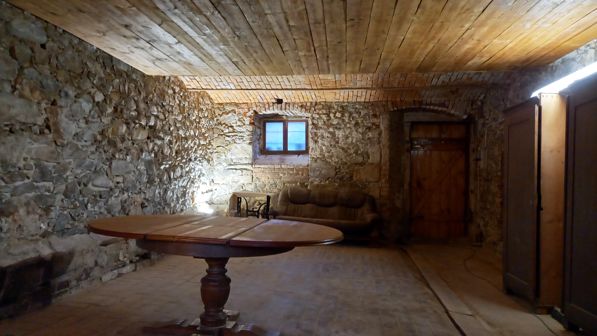 Ale nie bójcie się, pomieszczenie będzie w niedługim czasie także gruntownie odrestaurowane, jego ściany zbudowane są głównie z ciemnego bazaltu z elementami piaskowca i cegły wokół okien, a sklepienie to pięknie odrestaurowane łuki Kleina i sprytnie wkomponowany w to podwieszany sufit wyłożony starymi deskami odzyskanymi z innych pomieszczeń naszego domu.