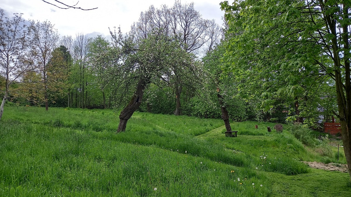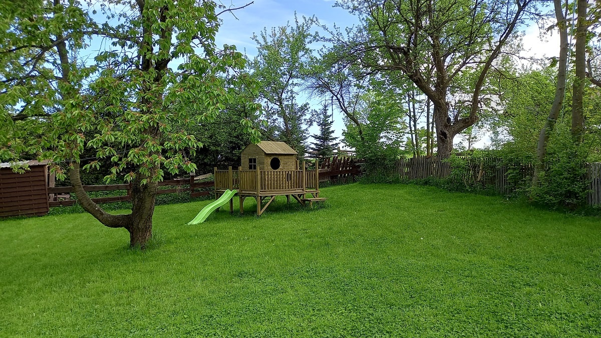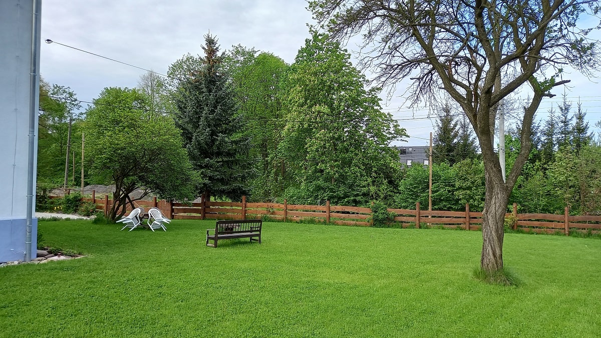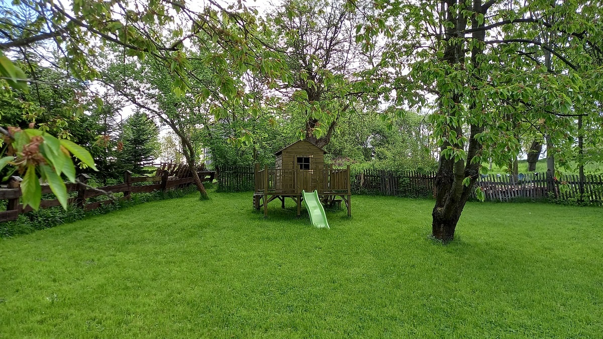 Ogród i stary sad – Biała Kalina położona jest na działce o powierzchni 5500 m2, znaleźć tutaj można część bardziej zadbaną w postaci sporego trawnika, domek zabawowy dla dzieci w cieniu starych czereśni, przestrzeń do posiedzenia pod drzewami lub też w pełnym słońcu, wydzielone miejsce na ognisko i biesiadowanie, oraz piękną Kalinę, pozwalającą cieszyć się swoim urokiem od wiosny do późnej jesieni. W drugiej części naszego ogrodu zobaczyć możecie obszar porośnięty naturalną roślinnością jak wysokie drzewa, krzewy, kwiaty oraz trawy. Znajdują się tam także jabłonie starych odmian jak złota reneta, antonówka czy też kosztele. Wszystko to w otoczeniu pięknej zieleni, gdzie usłyszeć możecie cudowny śpiew ptaków czy zaobserwować przelatującego nietoperza. A dodatkowo mamy wydzielone miejsce do nocnej obserwacji gwiazd, jako że jest to obszar o dużym zaciemnieniu i bez występowania bezpośredniego sztucznego światła.