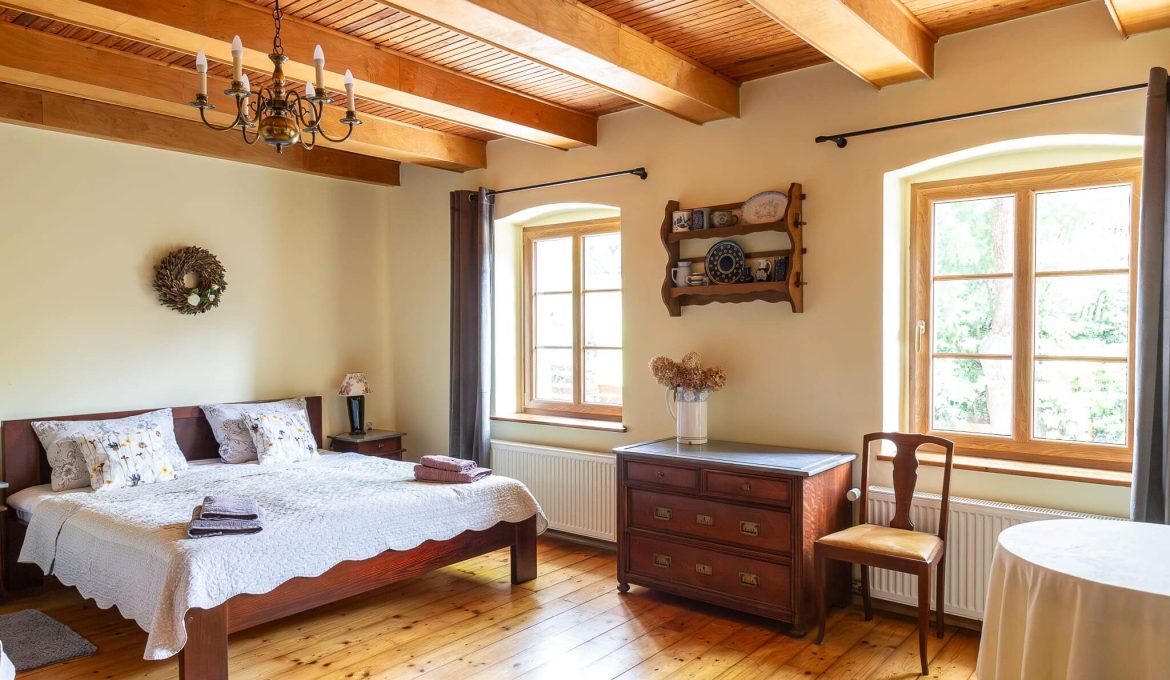Pokój Sielski – przeznaczony nominalnie dla 3 osób (łóżko małżeńskie i pojedyncze), ale umożliwia także wstawienie dodatkowej dostawki. Zgodnie ze swoją nazwą pokój wprawi Was w sielski nastrój, a wpływ na to ma głównie jego wystrój. Wraz z momentem pojawienia się w jego progu będziecie mogli oddać się pełnemu relaksowi 😉 Jest to drugi pokój przylegający bezpośrednio do kuchni, co również dodaje mu przestrzeni.